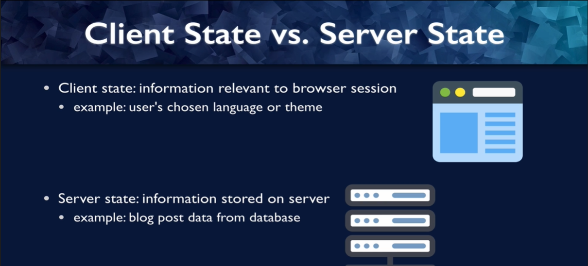 Server side, on the other hand, is data that is stored on the server but is needed to display on the client. An example of that might be blog post data that you are storing in a database.