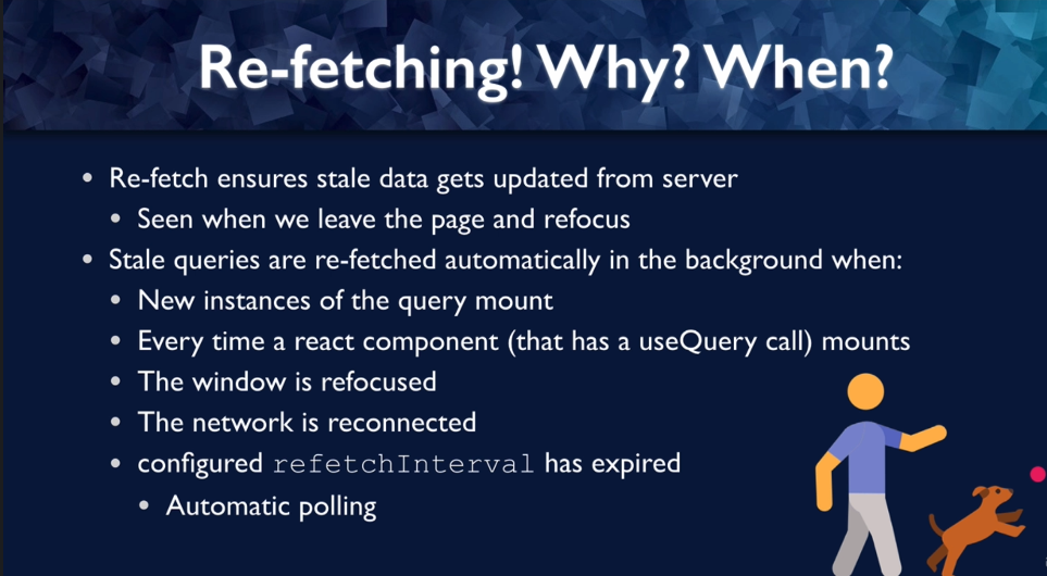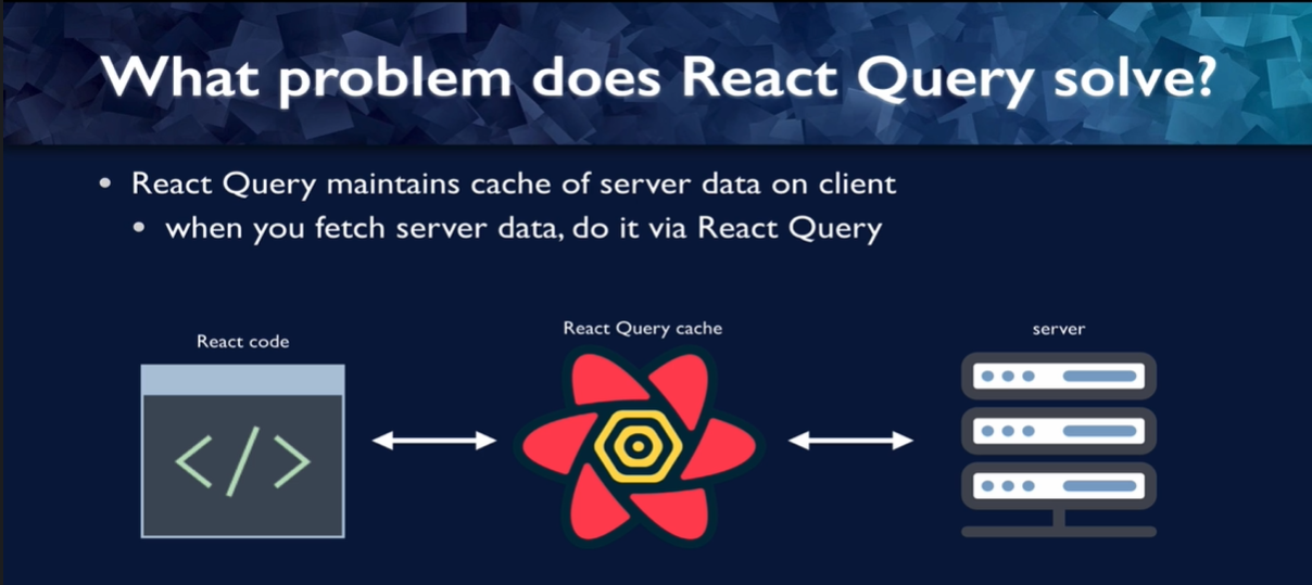 React Query maintains a cache of server data on the client. The way this looks is when the react code needs data from the server, it does not go straight to the server using,