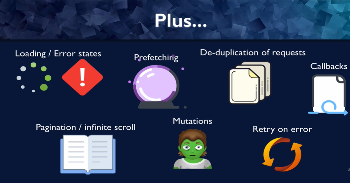 React Query can duplicate the requests. React Query can also manage retries if you get an error from the server and it provides callbacks so that you can take actions if your query