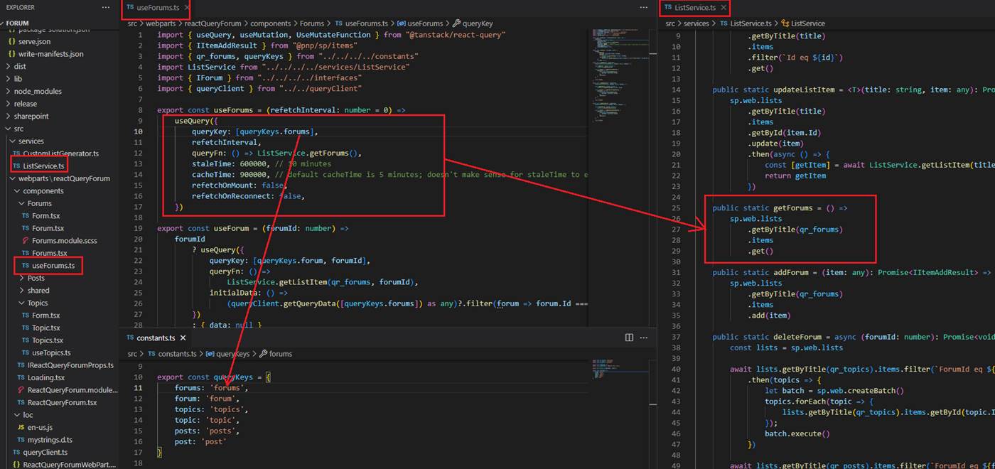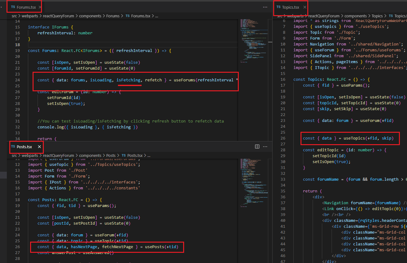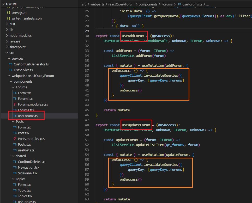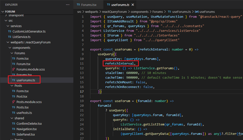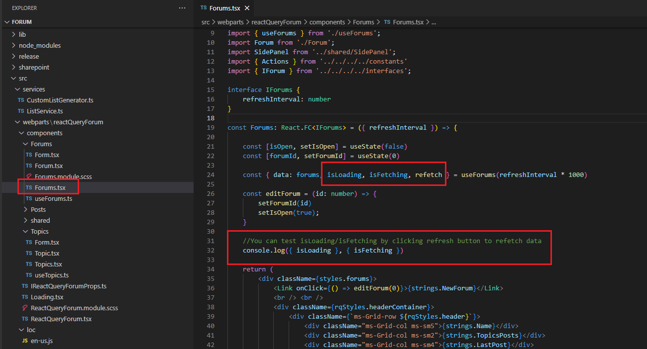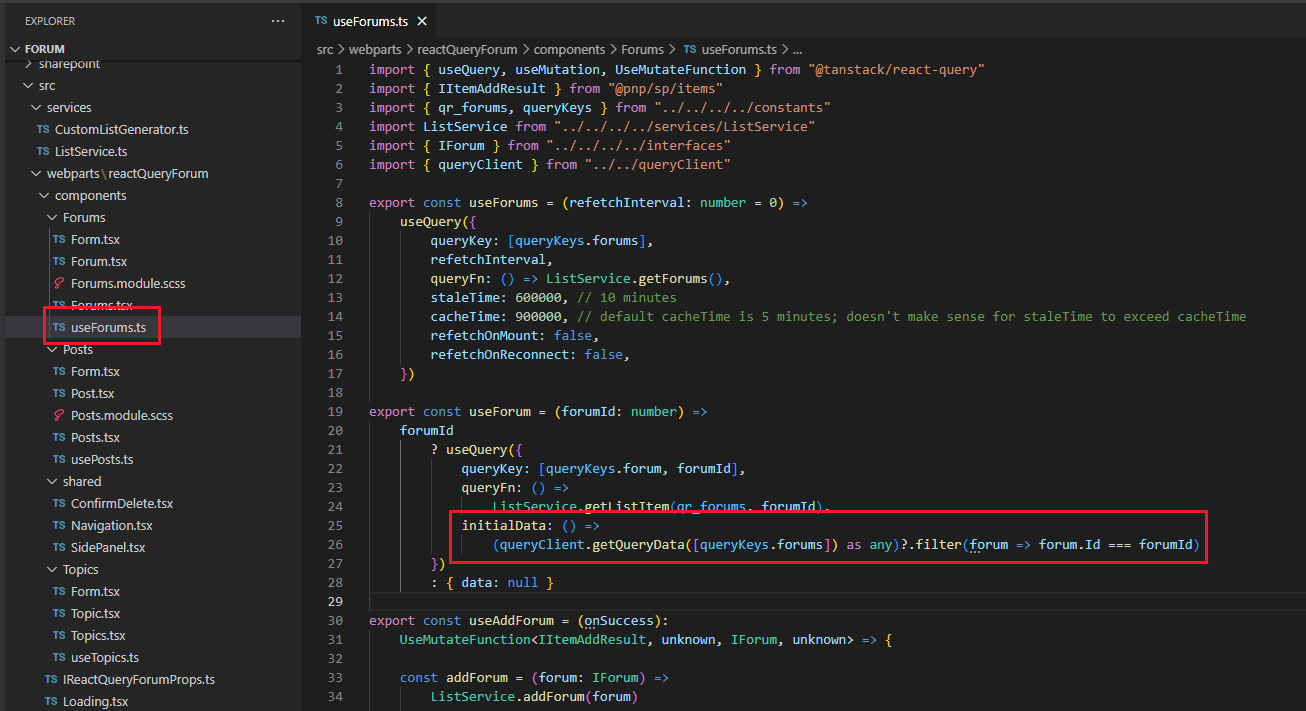 We define useForums hook and call it from the forums component to retrieve forums' from QR_Forums SharePoint list.