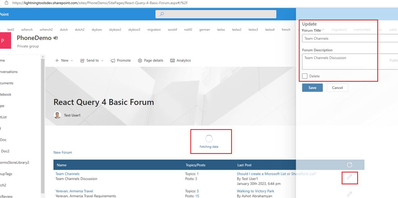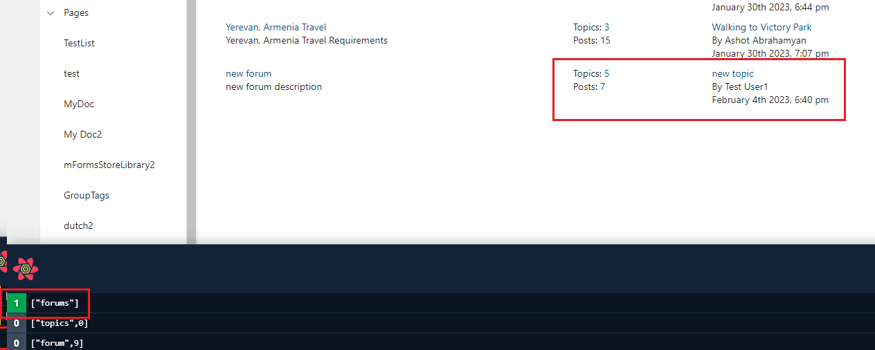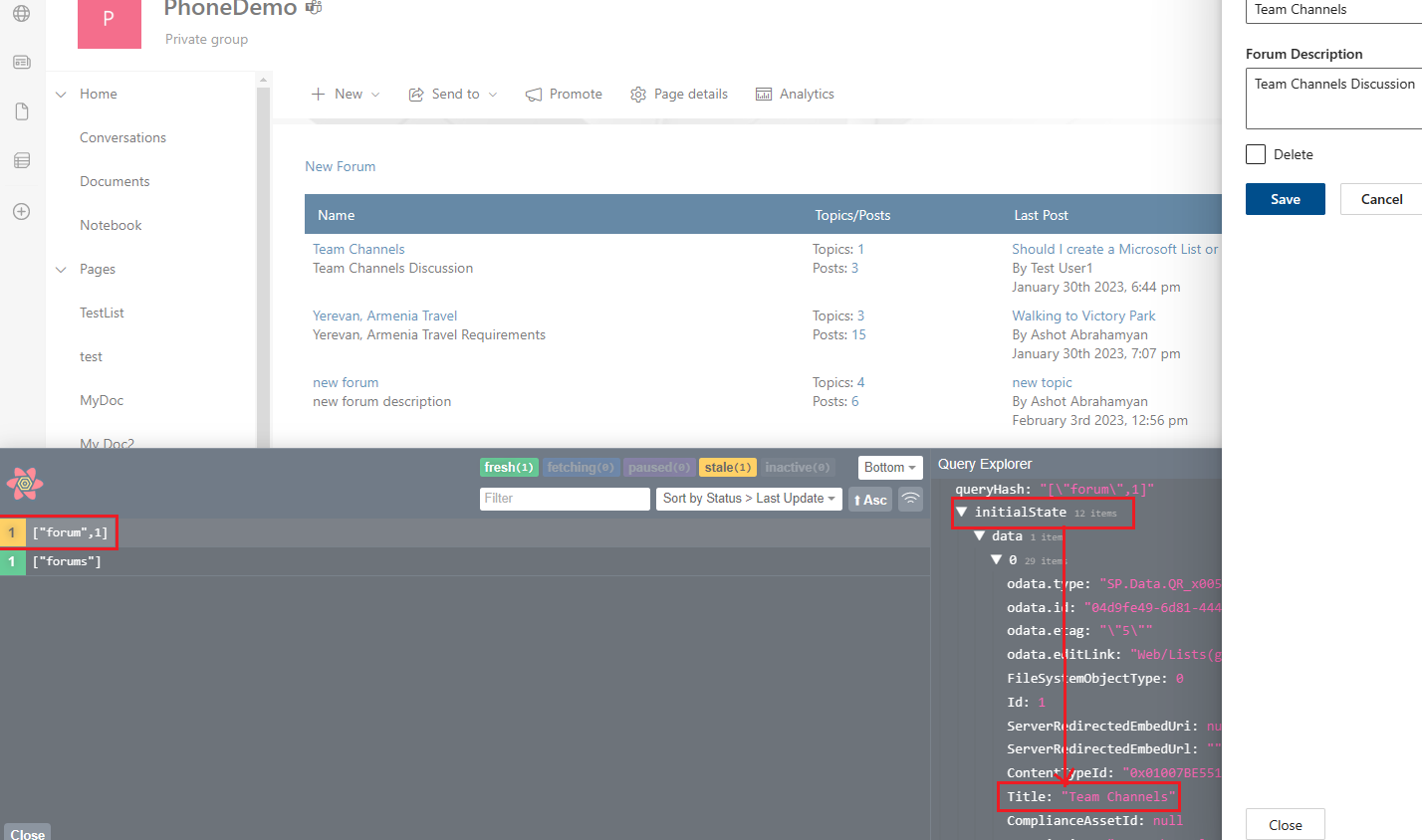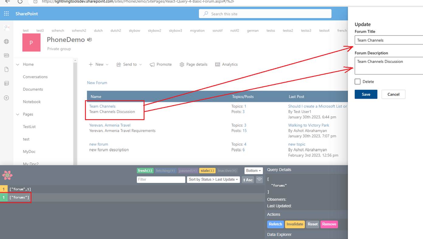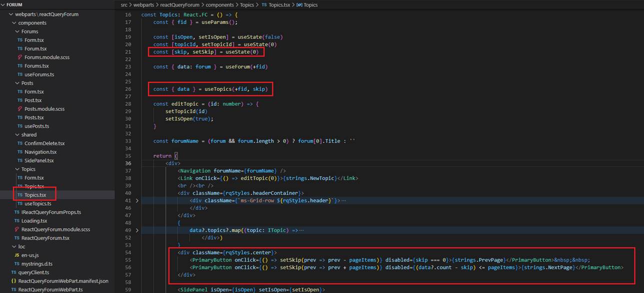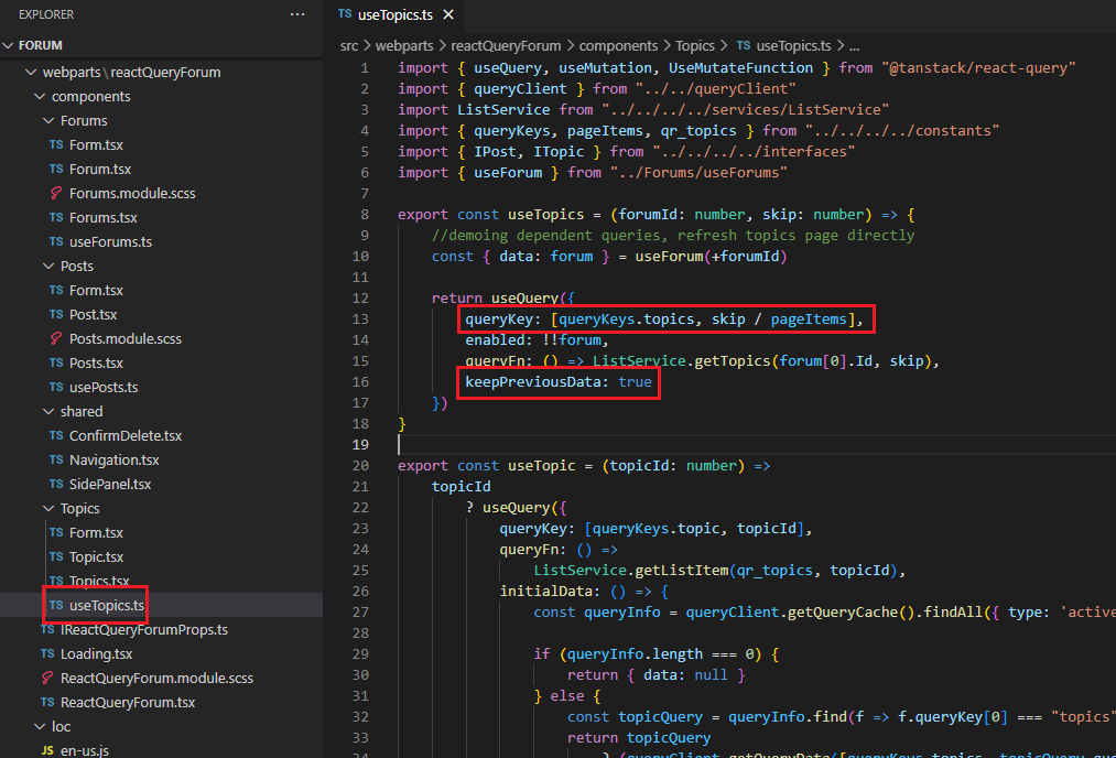 We define useForums hook and call it from the forums component to retrieve forums' from QR_Forums SharePoint list.