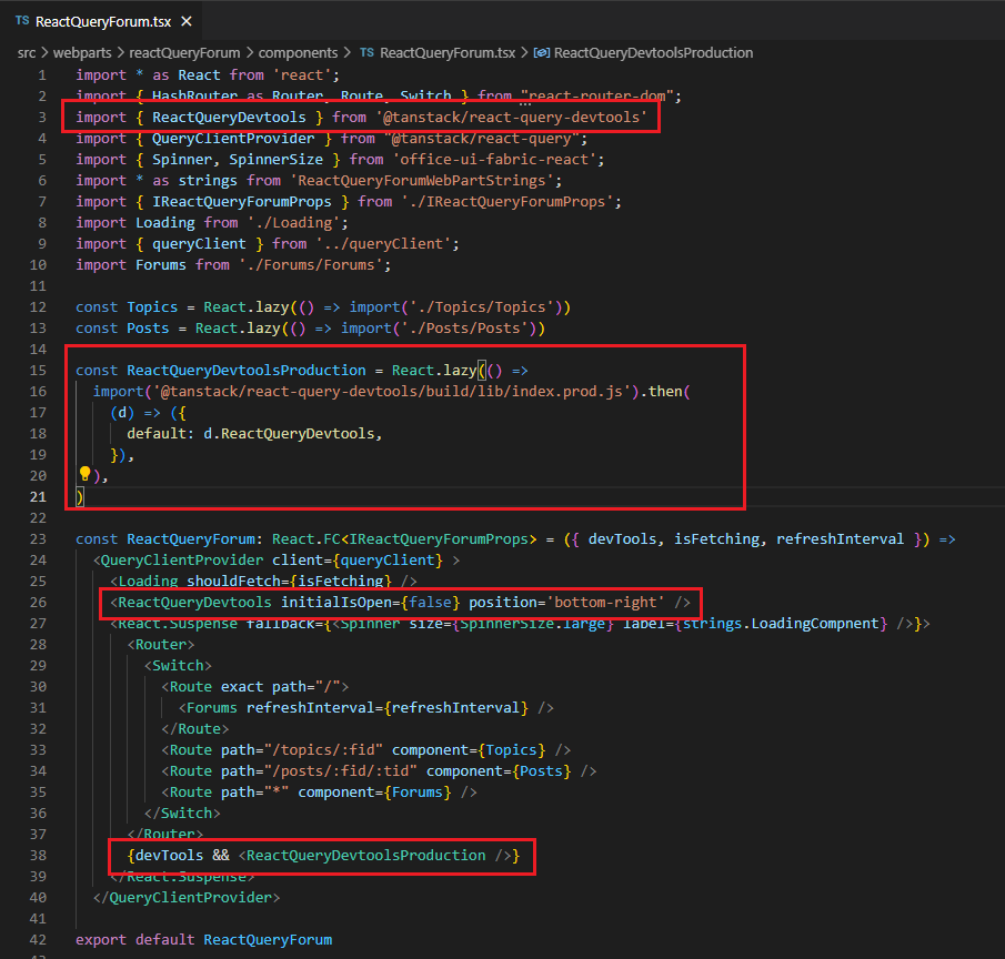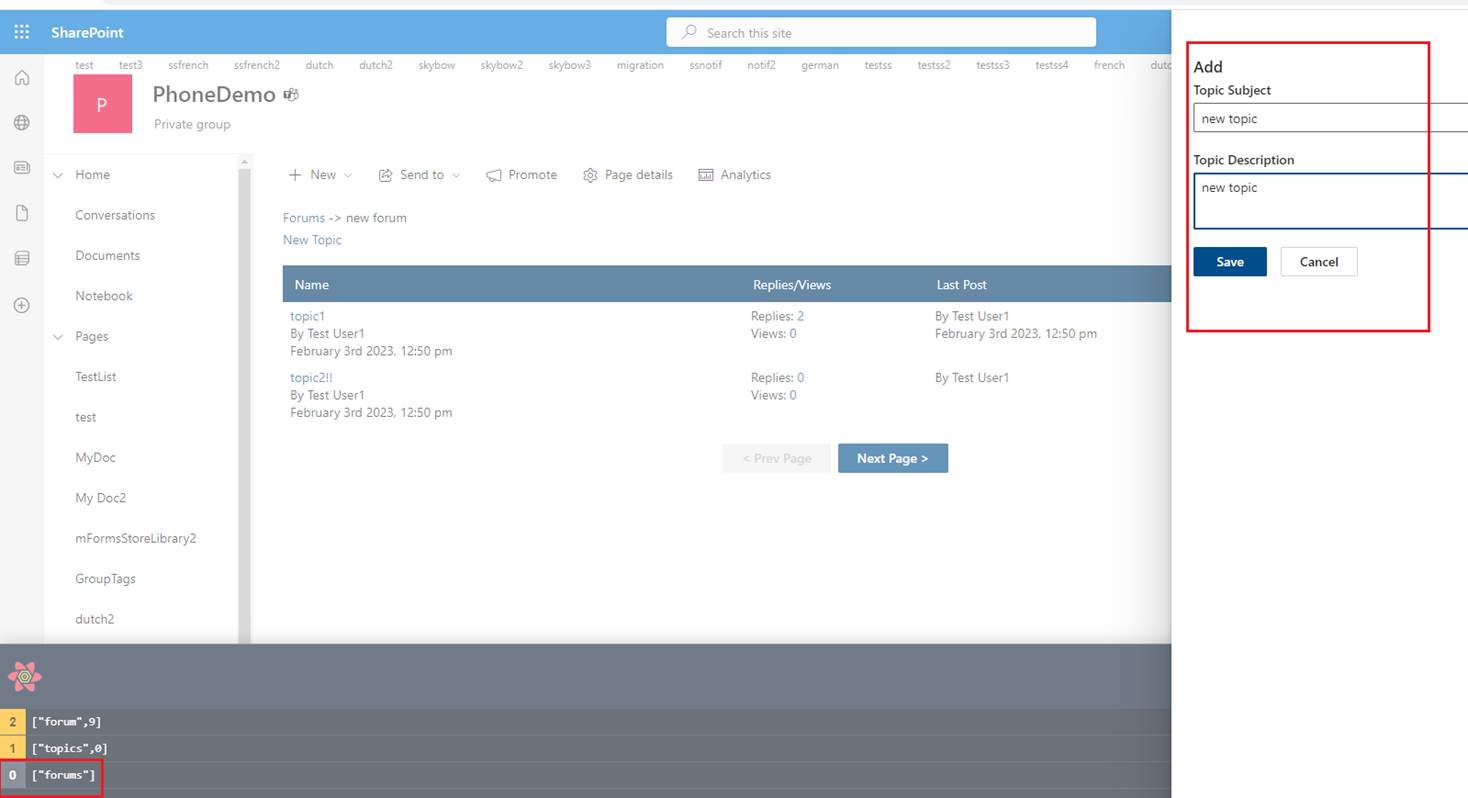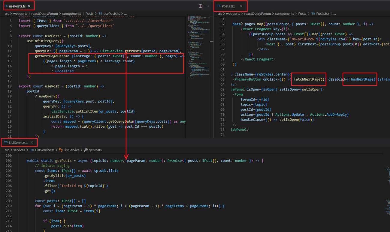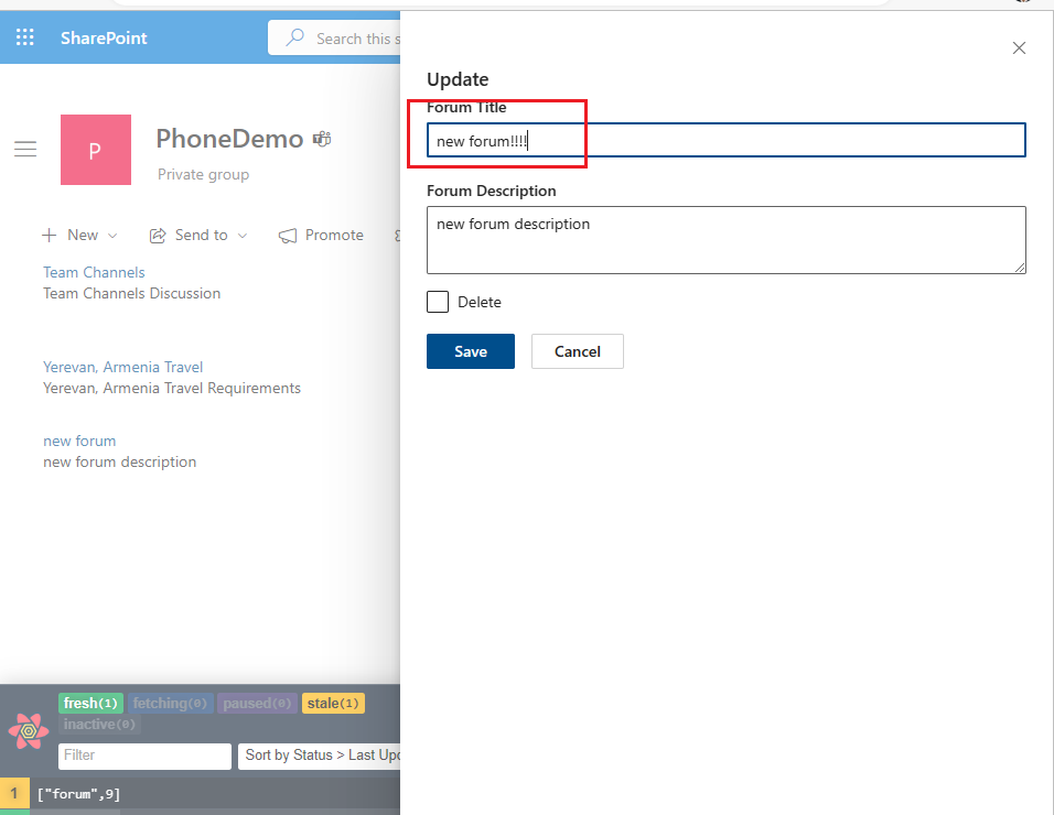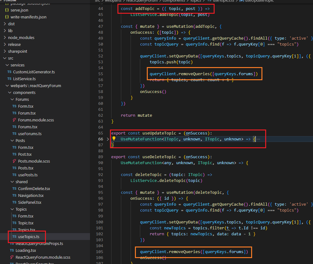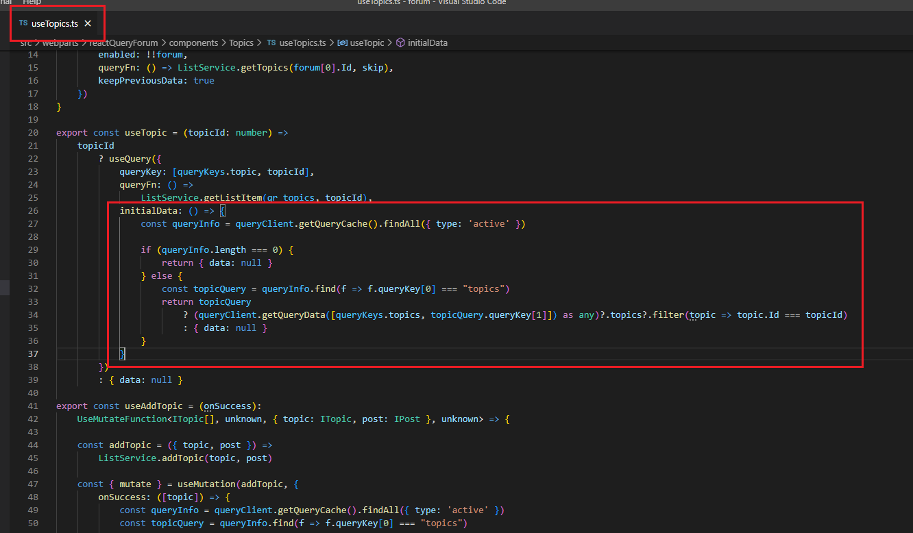 We define useForums hook and call it from the forums component to retrieve forums' from QR_Forums SharePoint list.