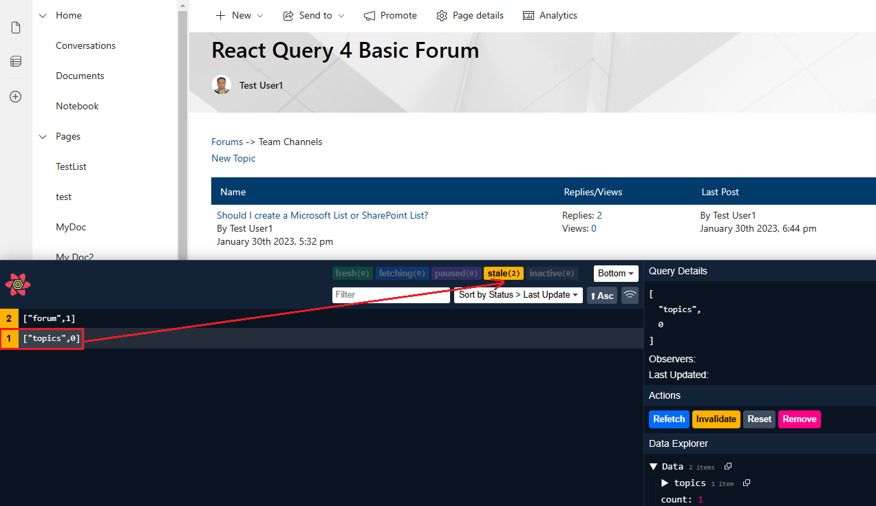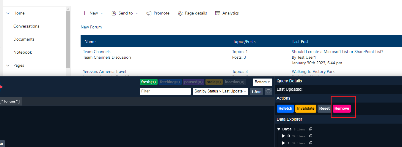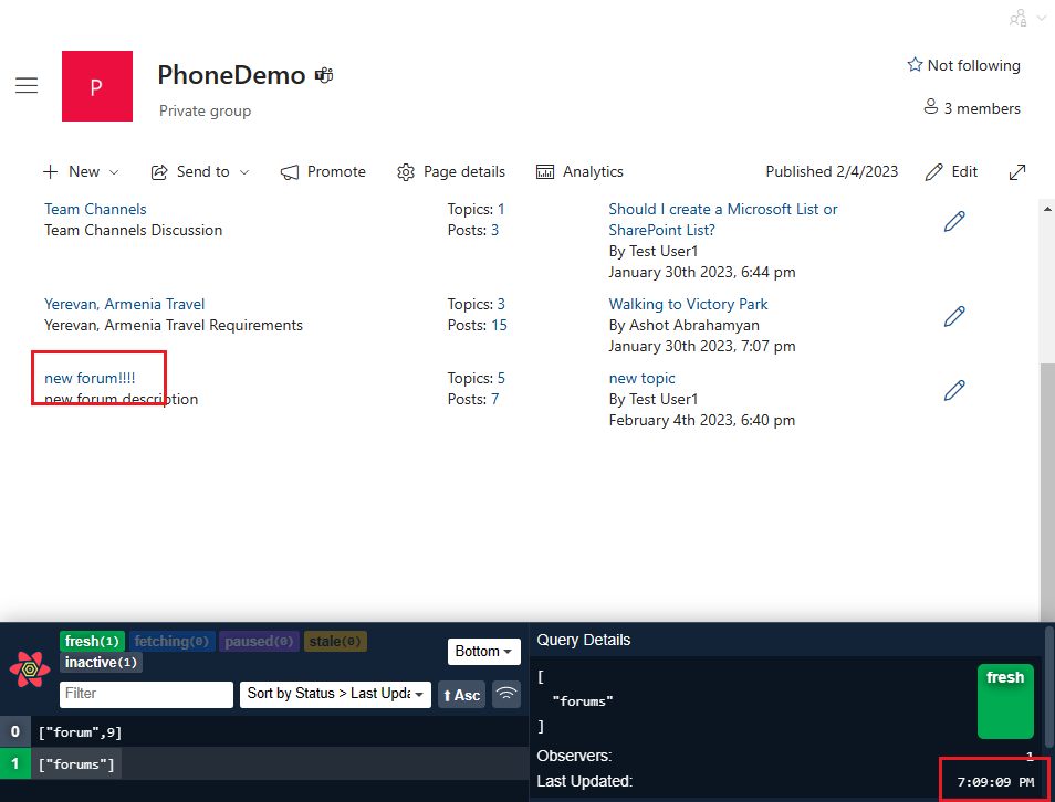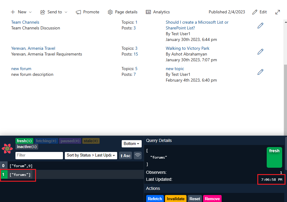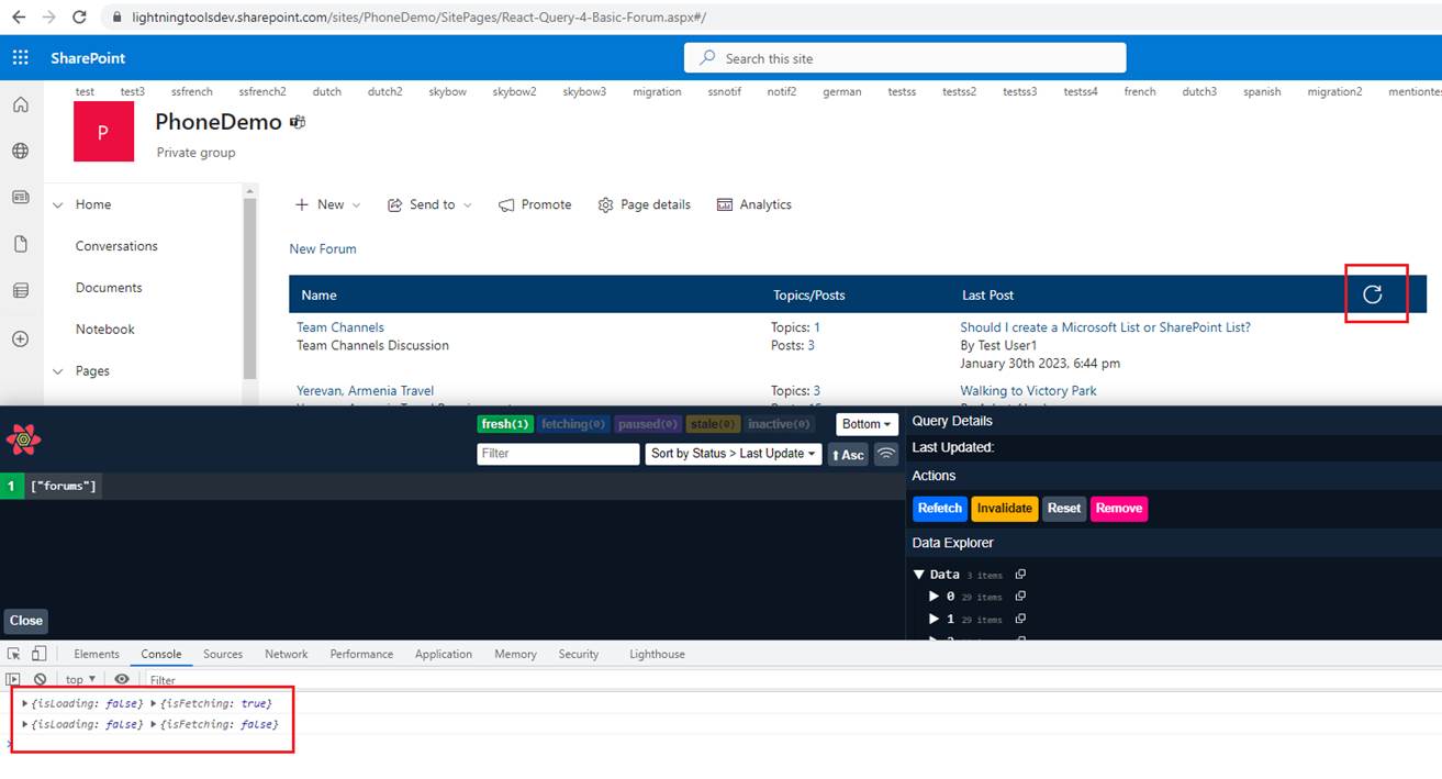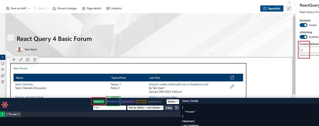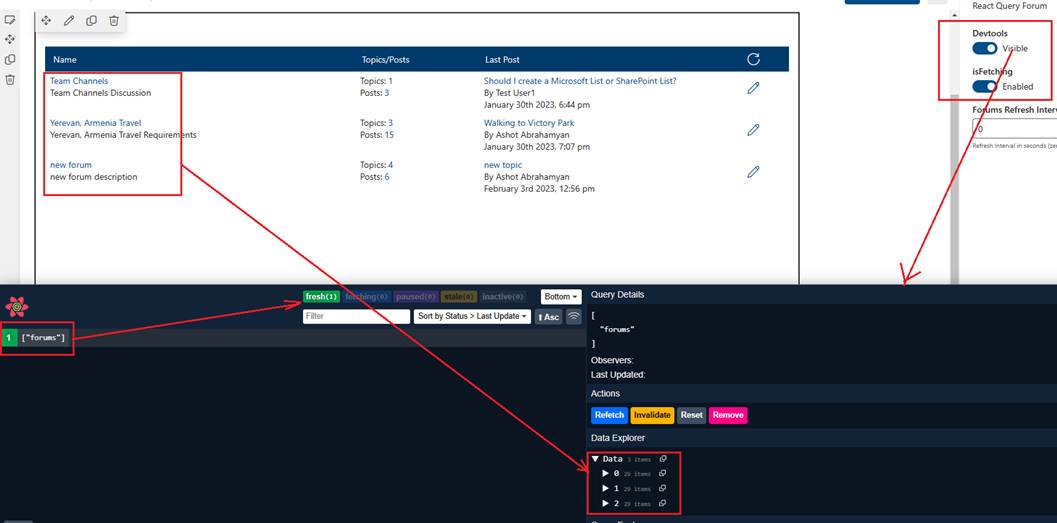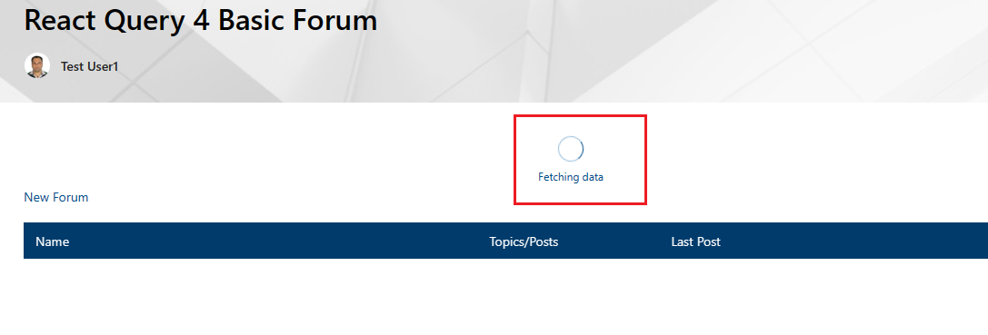 When you refresh forums page you will see Fetching data loading indicator. React query result has two properties isLoading and isFetching.