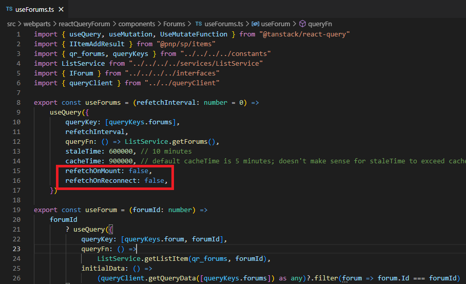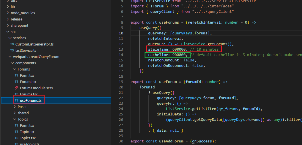 In useForums hook the option we are going to update is staleTime and it is in milliseconds. I am going to allow forums page to be out of date