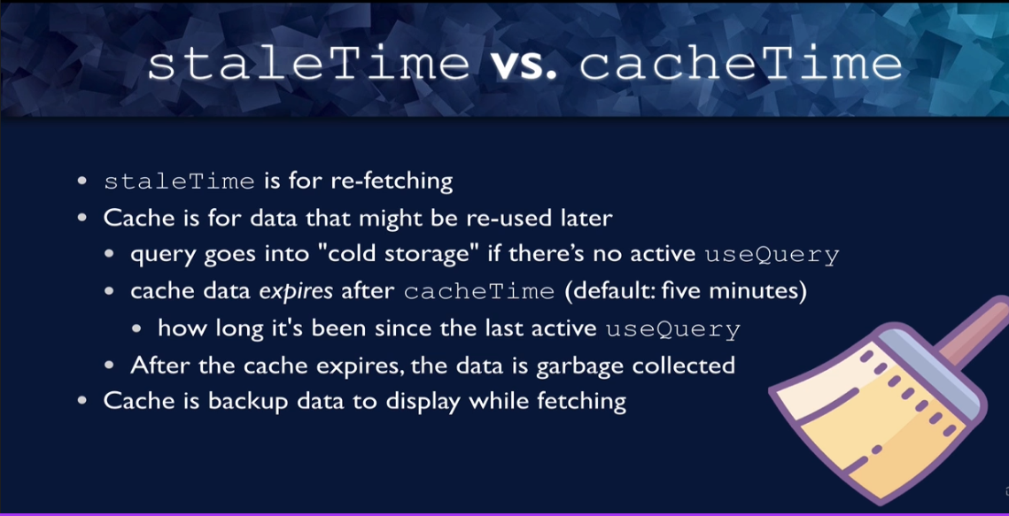 As we already know staleTime is consideration when refreshing. The cash is data that might be needed later. So, if there is no active query for a particular