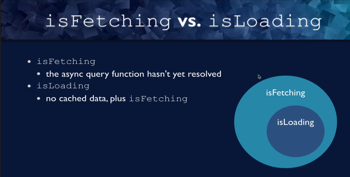 isFetching is true when the async query function had not yet resolved. We are still fetching. isLoading is the condition
