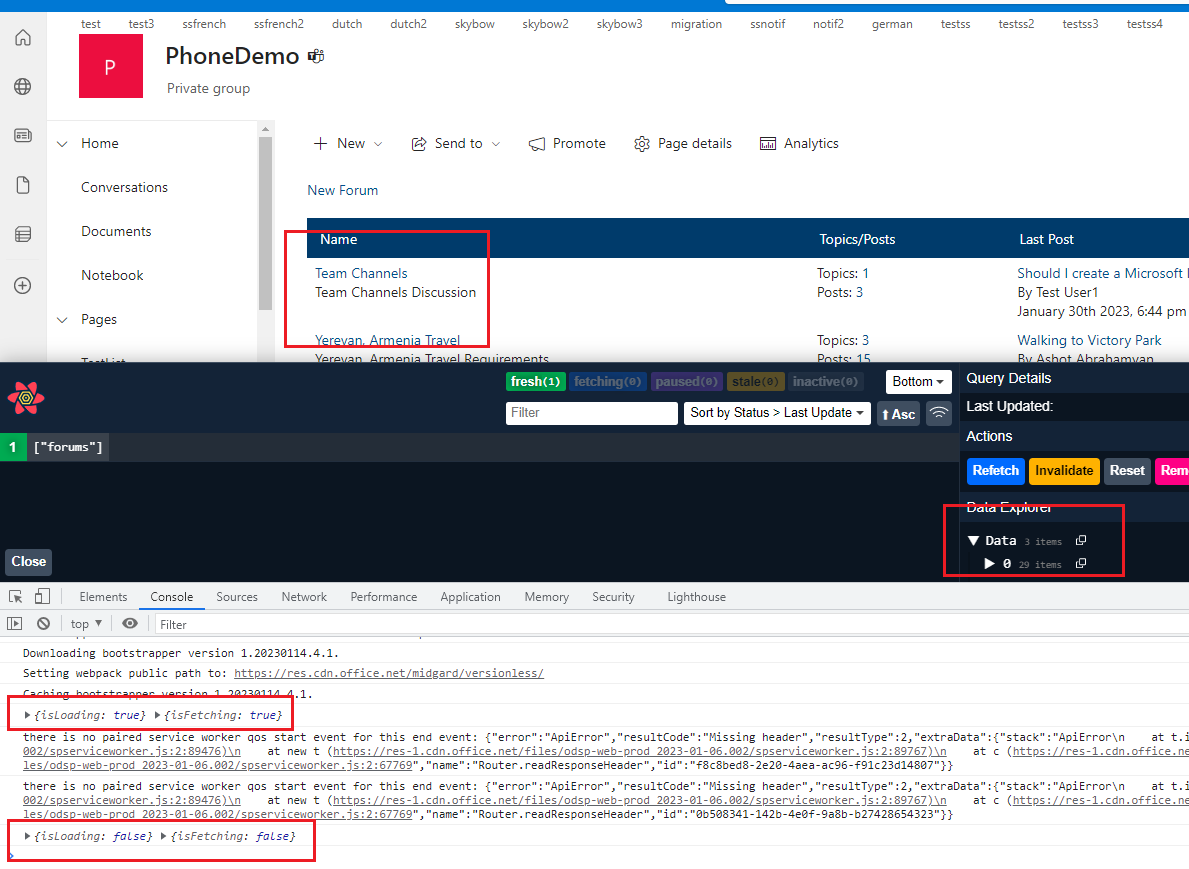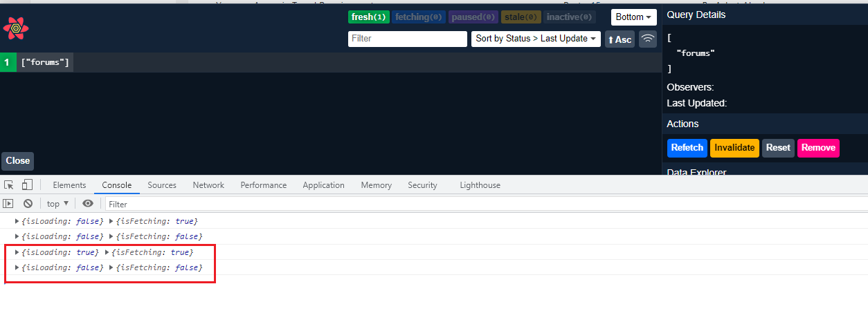 Let's load Forums page. You see that both isFetching and isLoading is true as we are fetching data and no cached data. Once we received forums' data both isLoading and