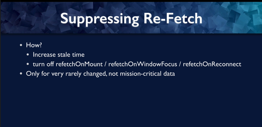 We also specified two properties refetchOnMount and refetchOnReconnect and set them false. The query will not re-fetch on mount