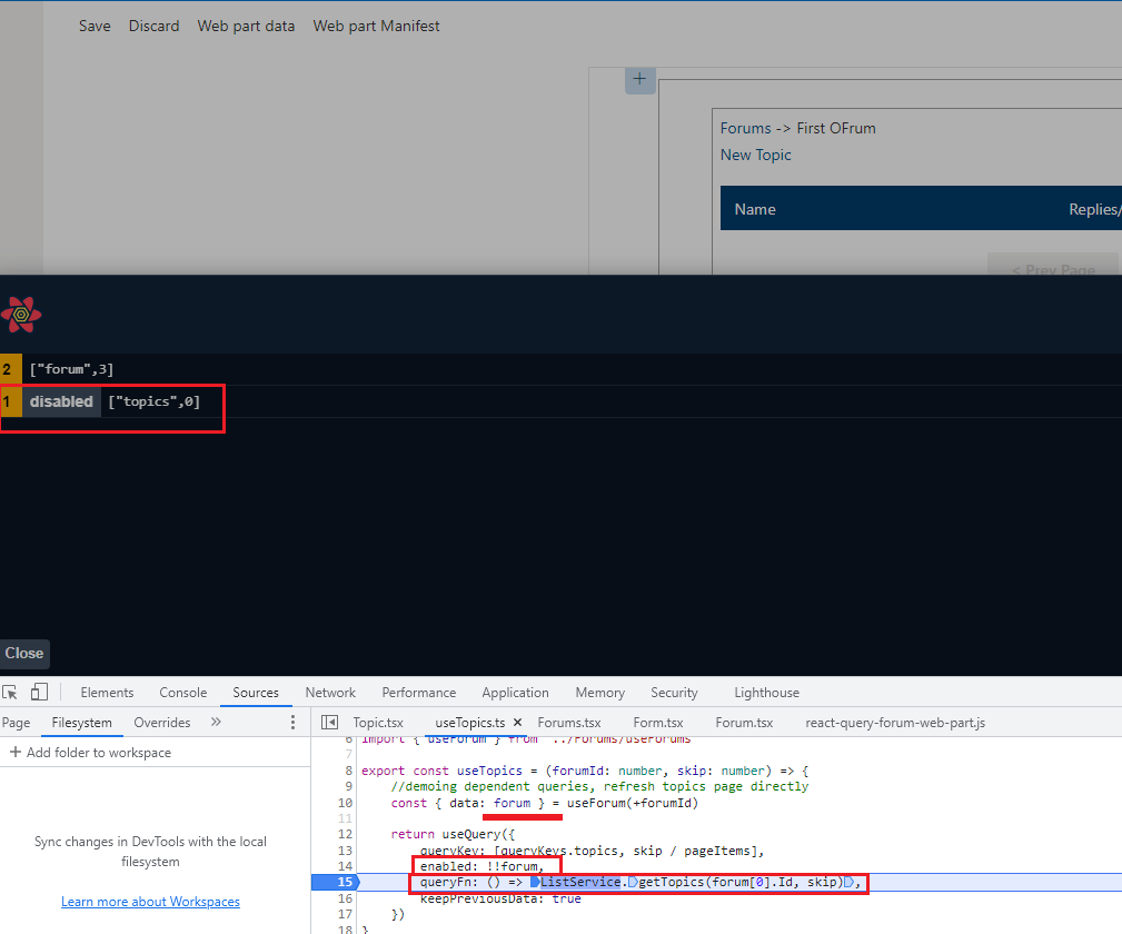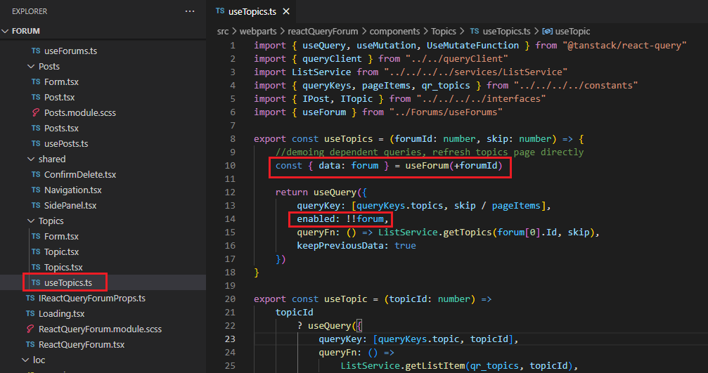 We want the second query that retrieves topics to be fired only after the forum Id has been retrieved. For that reason, we set enabled property. With enabled we are saying