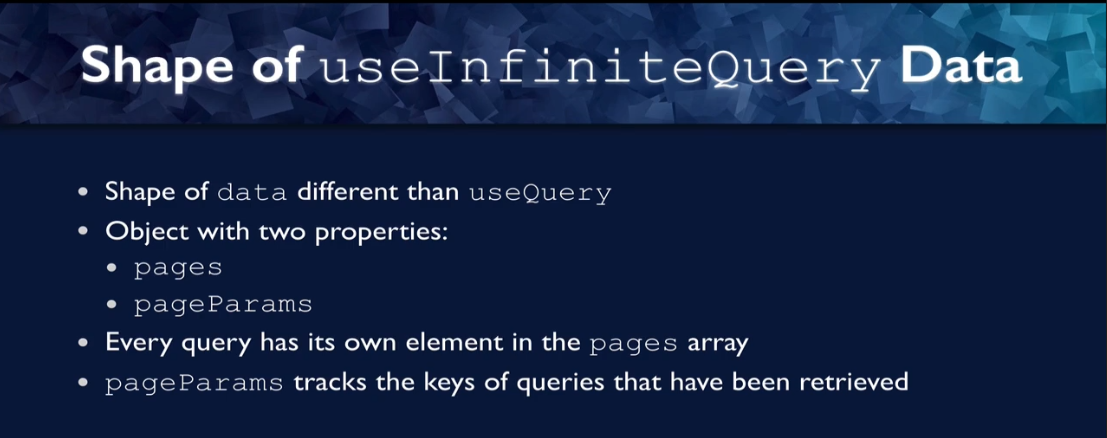 useInfiniteQuery. The object actually has two properties. The data object has two properties. It has pages, which is an array of objects for each page of data.