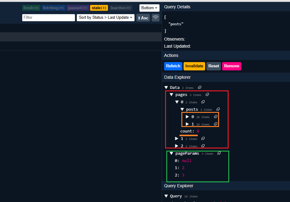 I loaded the post page and clicked on 'load More' button twice. We have three pages with three pageParams and each page contains 2 posts (pageItems is 2) and overall posts count which is 8 in this case.