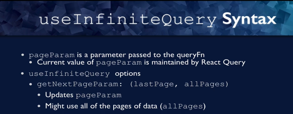 The useInifiniteQuery syntax also differs from useQuery and this is where the power is. This is where we can use it to keep our infinite scroll going.
