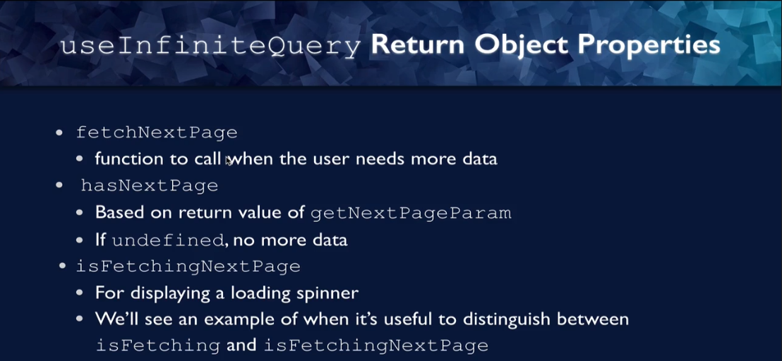 We also have isFetchingNextPage, this is something that useQuery did not have any concept of but useInfiniteQuery can distinguish between whether it is