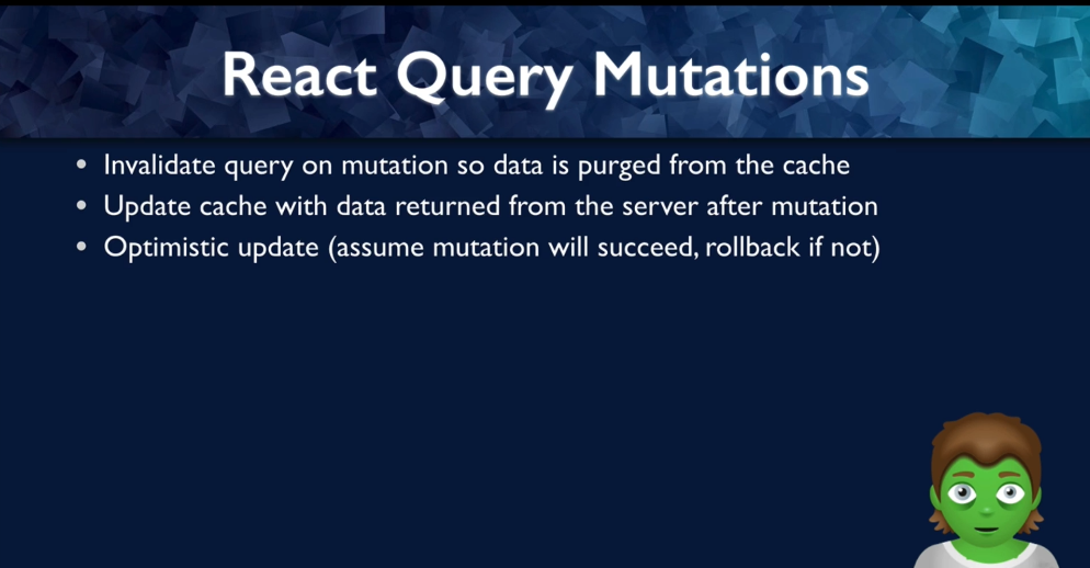 We will also take a look at optimistic updates, and by optimistic we mean that we are hopeful that our mutation is succeed, but we are able to roll back