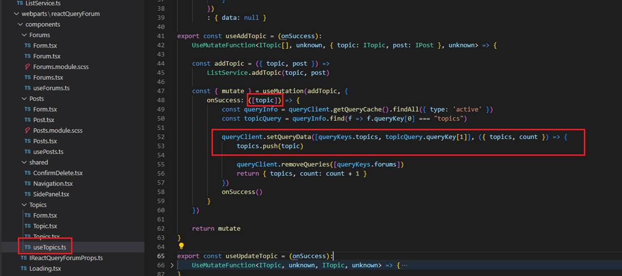 What we do is we get the topic's info from onSuccess callback of useMutation and use setQueryData method to update query cache.