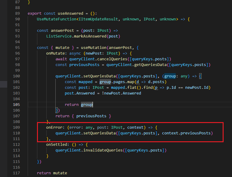 onError function is called if the mutation encounters an error. In case of errors, we set previousPosts data as query data.
